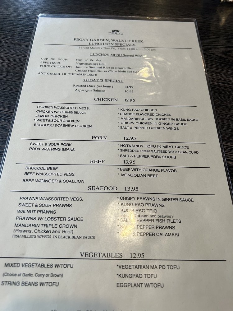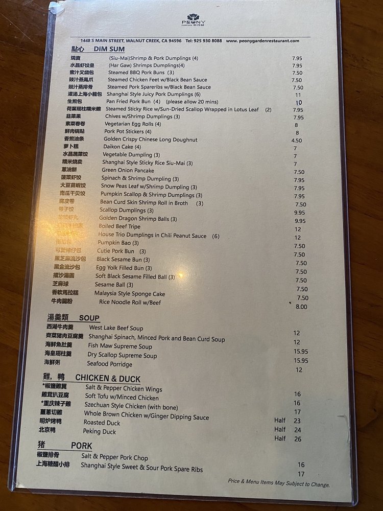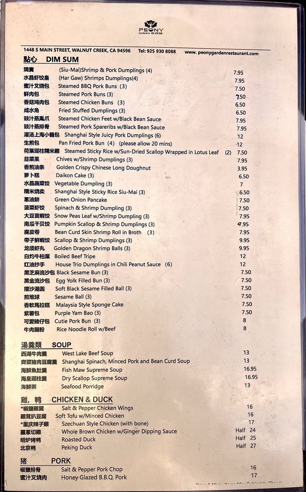 Peony Garden in Walnut Creek offers authentic Cantonese cuisine in a warm and inviting atmosphere. With a wide variety of classic Cantonese dishes like dim sum and soups, all prepared with fresh ingredients, this charming restaurant provides a delightful dining experience. The staff is friendly and attentive, the portions are generous, and the service is top-notch. The beautifully decorated restaurant creates a serene ambiance, perfect for casual lunches or special occasion dinners. Customers praise the high-quality food at reasonable prices and the ease of parking. The outdoor seating area is a highlight, surrounded by trees and a calming fountain. Peony Garden stands out for its distinct dishes, such as their special purple yam bao and flavorful BBQ pork chow mein, leaving patrons eager to return for more.